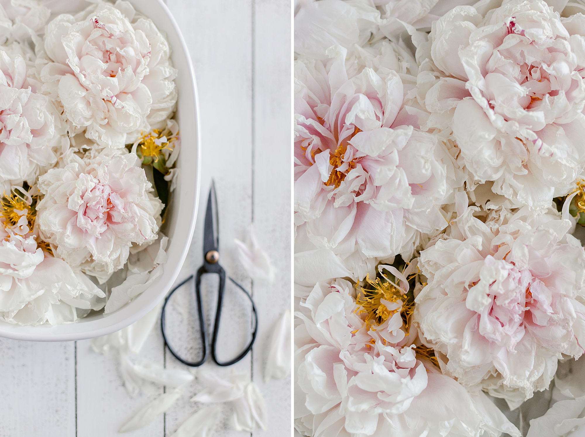 I waited until the very last moment to cut these blooms and photograph them, mostly because it’s just hard to cut. They are completely opened and starting to get a little tired, some of the petals were starting to fall off the back but I didn’t care. I loved how soft and full they were together and styled them the best I could. Floating them in water was one way to keep them together and my favorite image is the right bottom below where they fill the frame.